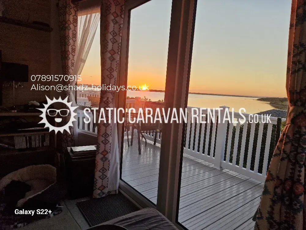 It has wrap around decking with ratten garden furniture to sit and enjoy the stunning views over The Fleet Lagoon.