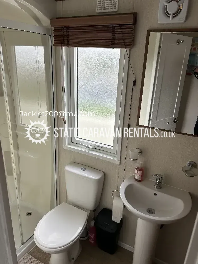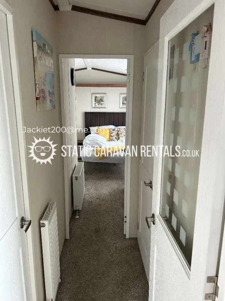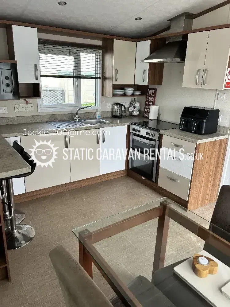 The open plan interior is bright and spacious with a large patio door that lets in loads of light and allows you to admire the views in comfort. The huge free standing lounge furniture is incredibly comfortable and great for sociable living. The lounge also boasts a large TV unit and shelving above that looks great and provides extra storage space.