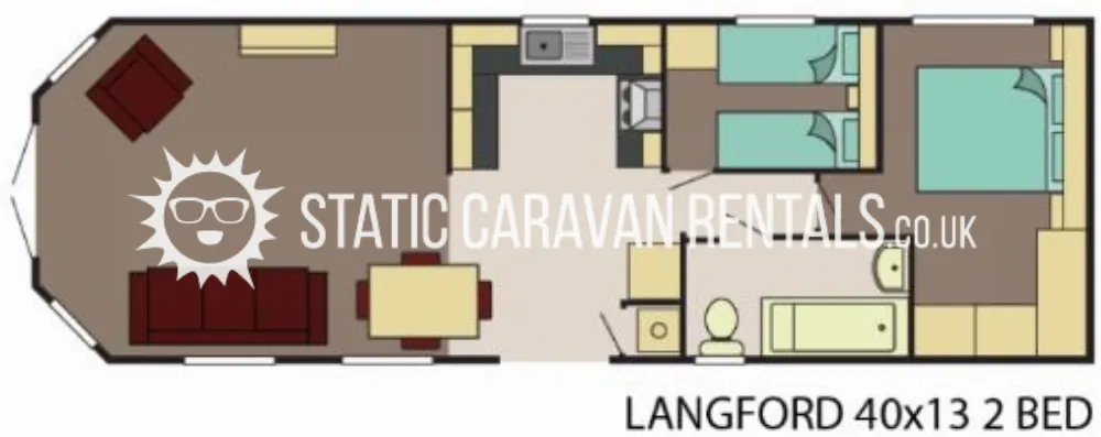 Delta Langford caravan, 40ft x 13ft, Sleeps 6; King size bed in main bedroom. 2 single beds in second bedroom • Sofa Bed in the Living Area. DVD Library, Books & Toys.