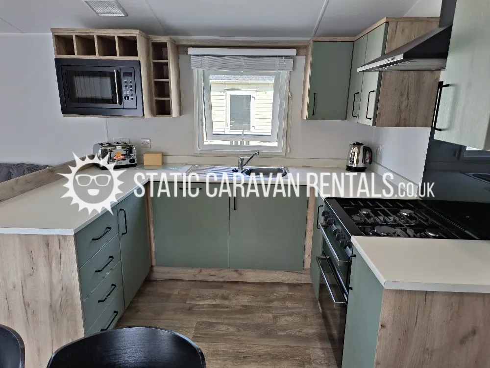 within the modern kitchen is a 70/30 fridge freezer,& everything you could possibly need whilst on holiday. there is also a dining table & 4 chairs,, a washing machine ( please use pods & liquids. thankyou), microwave, gas cooker etc.