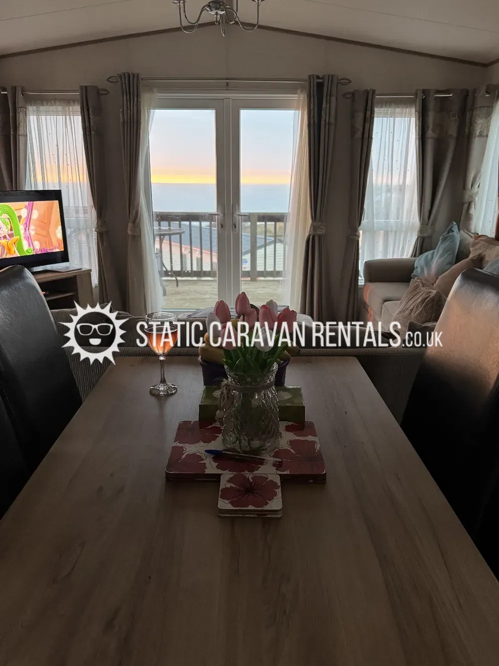 Inside, the caravan features a bright and airy open-plan living space, combining comfort with modern style. The lounge area is warm and inviting, with a 50" Smart TV for cosy nights in, and Starlink WiFi included so you can stay connected throughout your stay. Watch the sun go down from the sofa if its a bit chilly outside!