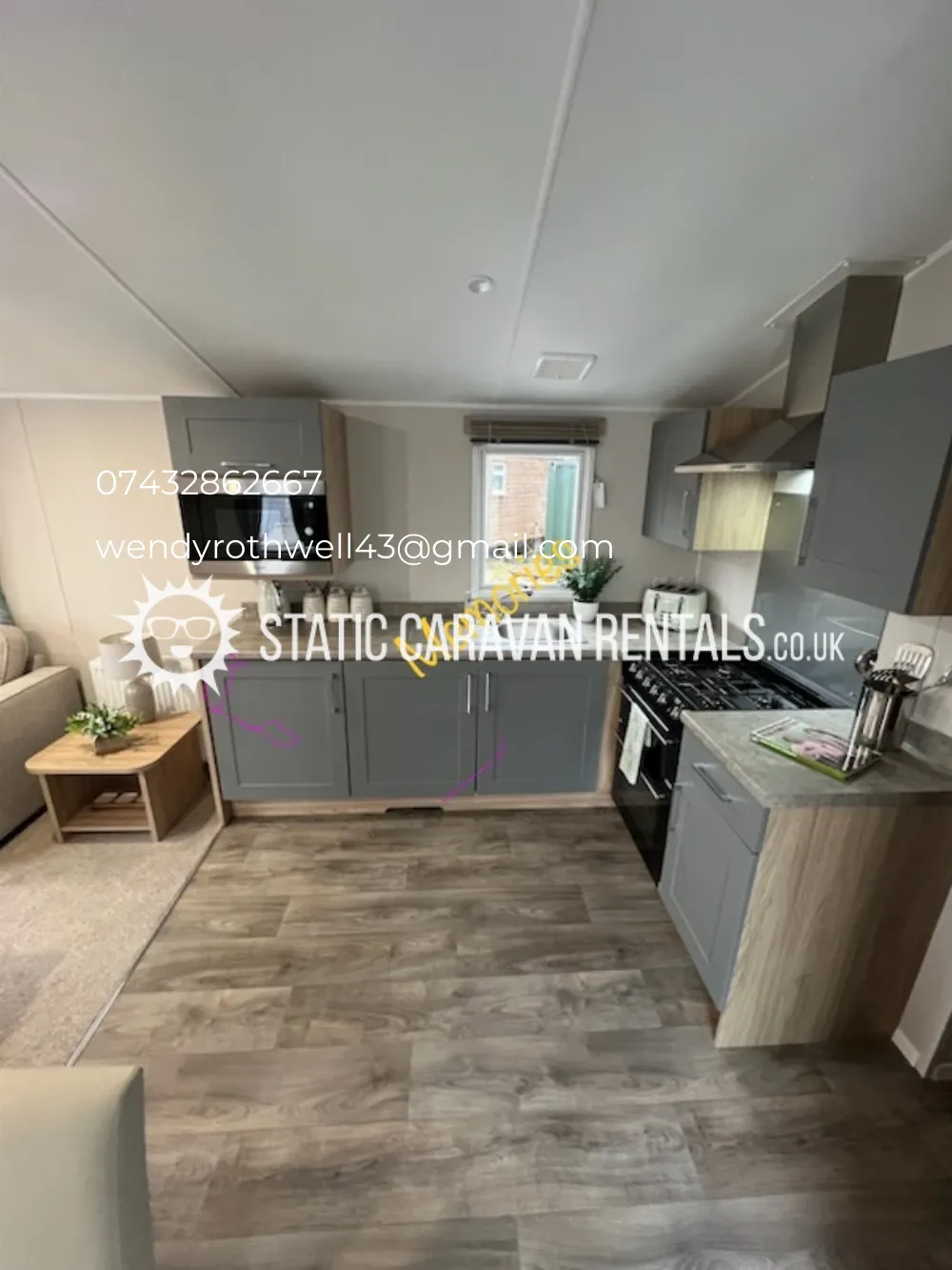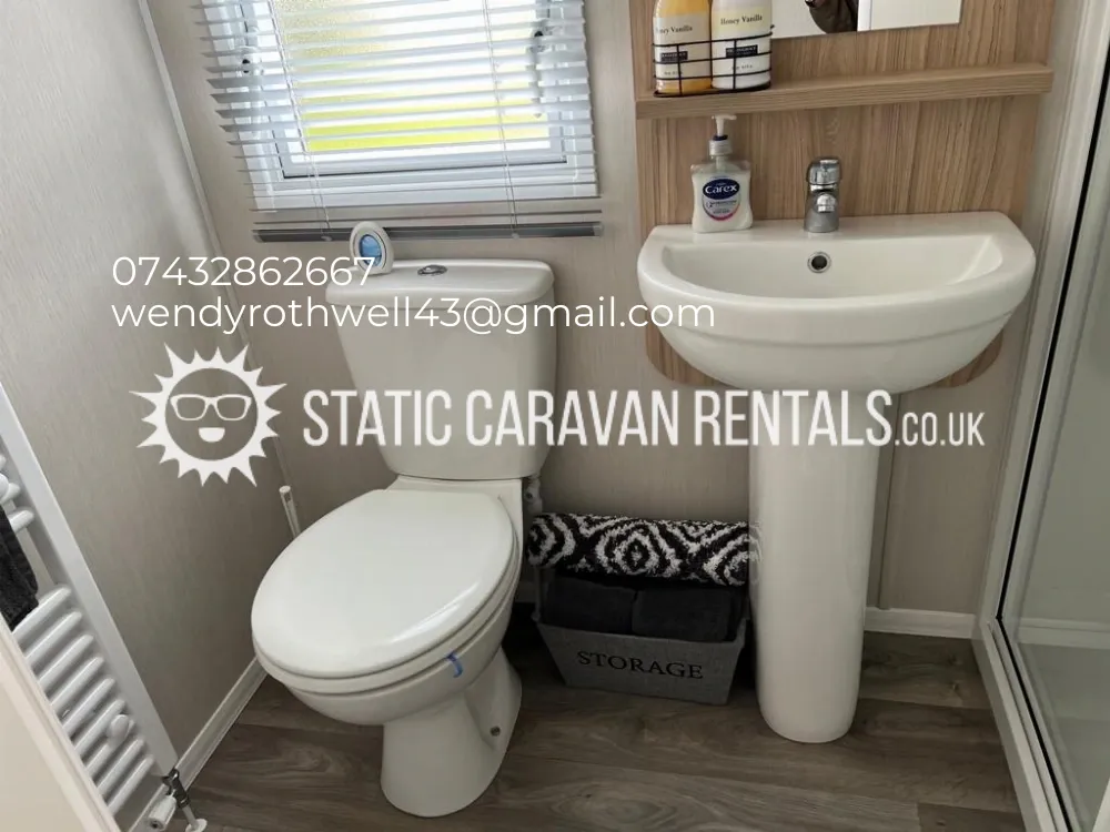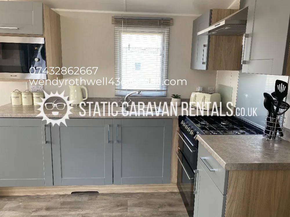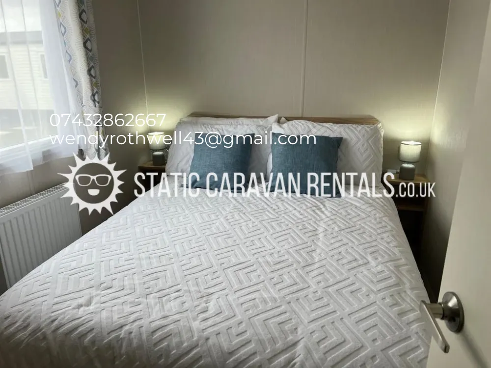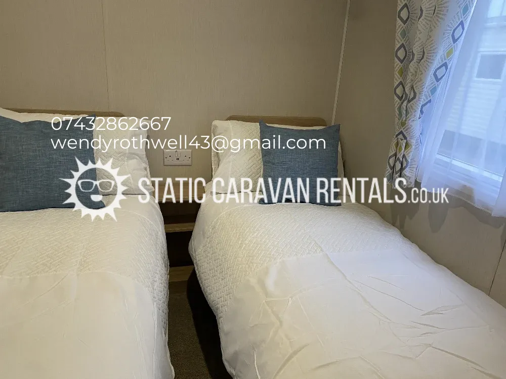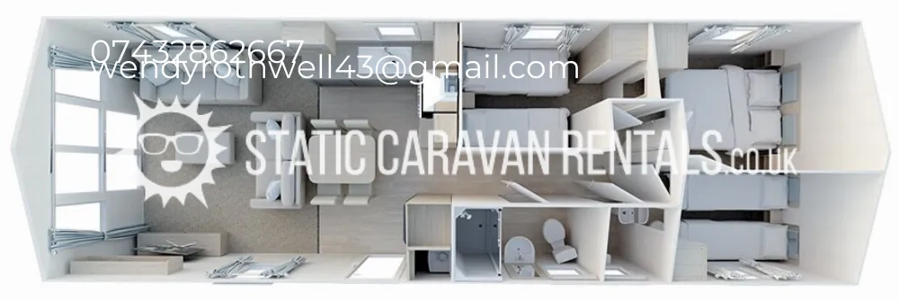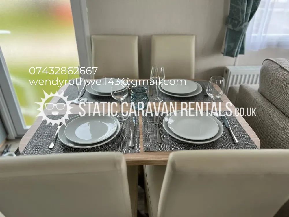 6 berth, 1 double, 2 twin with 1.5 bathrooms (one shower with wc and one wc). Free standing furniture, Smart TV, dining table, fridge/freezer and fully equipped kitchen. Bedding supplied.
