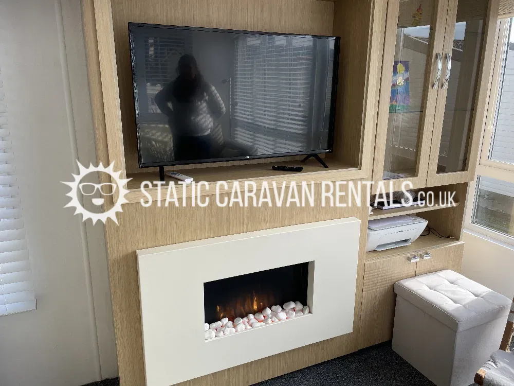 o The lounge/diner features free-standing furniture, a large flat-screen TV, a fire, and a dining table with chairs.